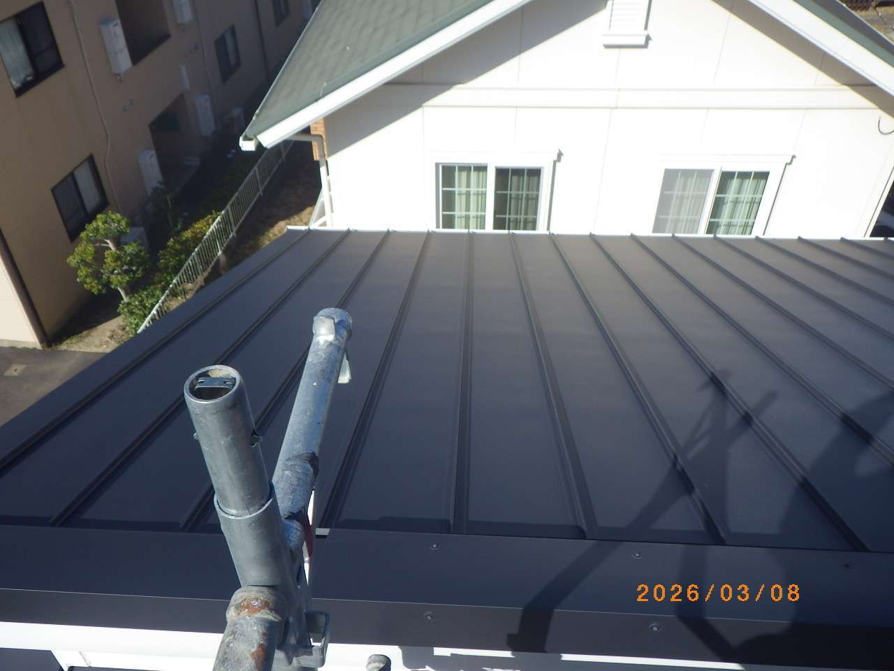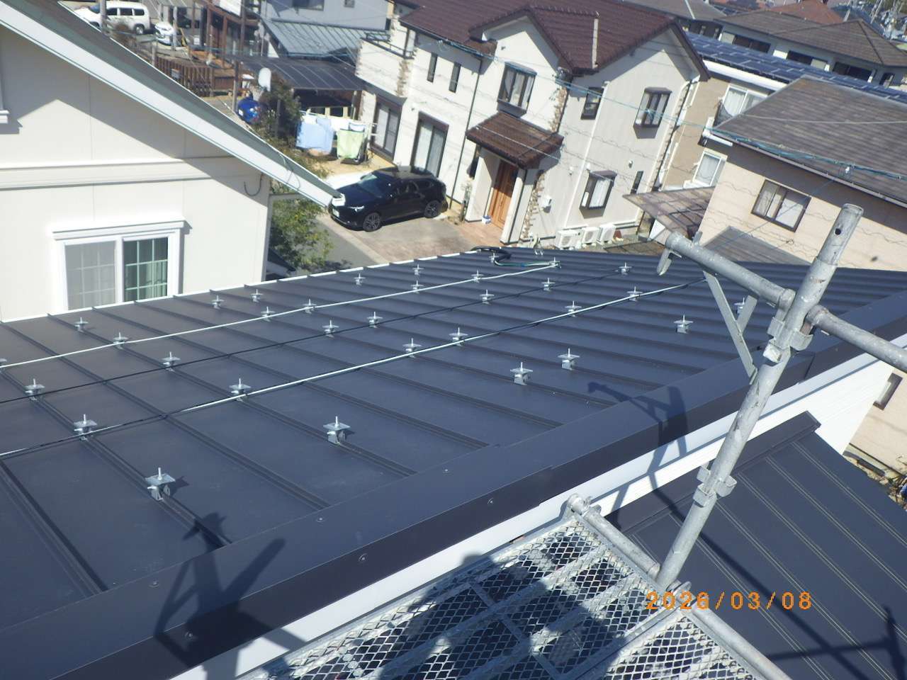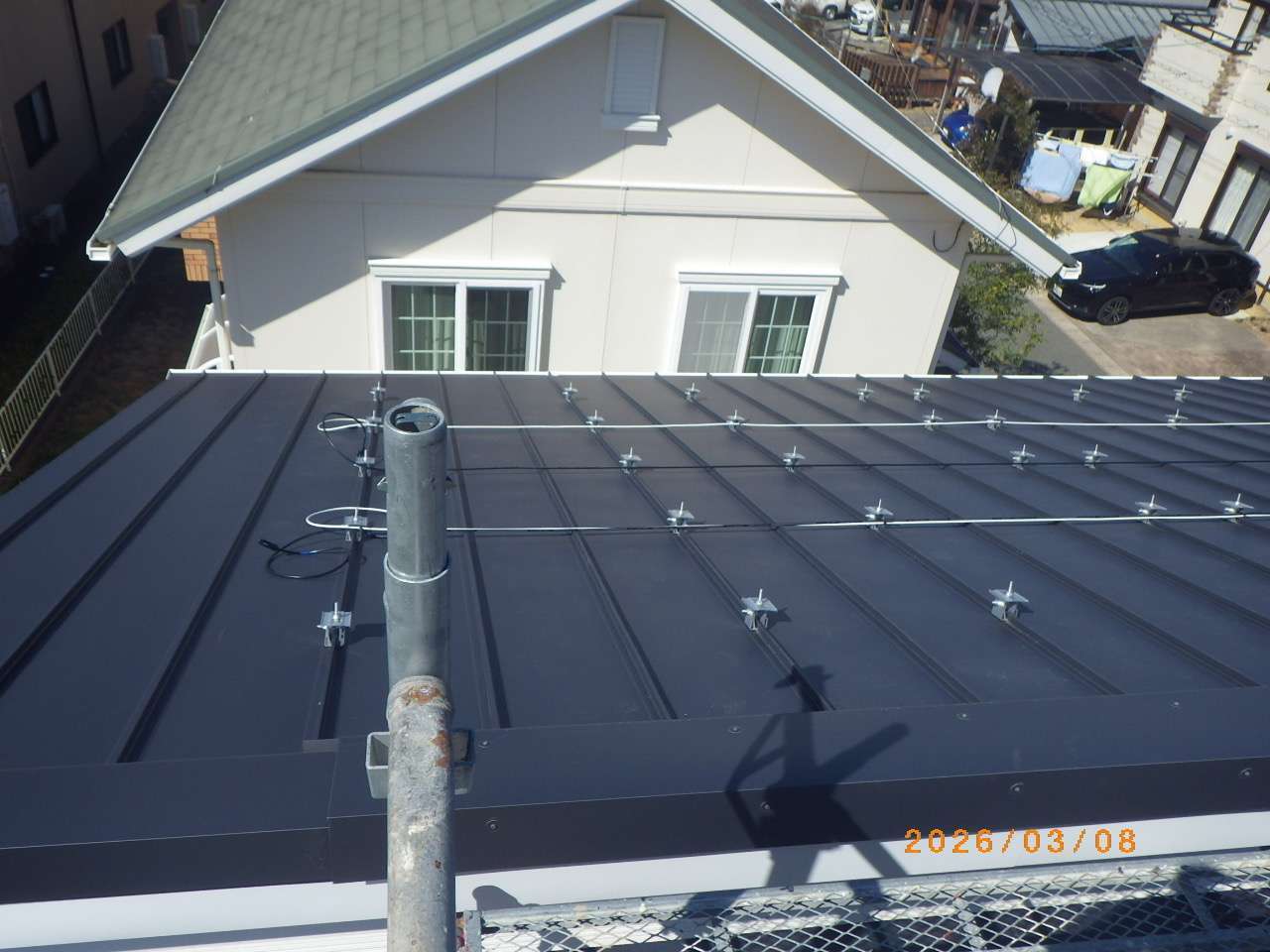 屋根形状は立平葺きで、屋根材の構造に合わせた専用工法にて、しっかりと固定・施工しております。