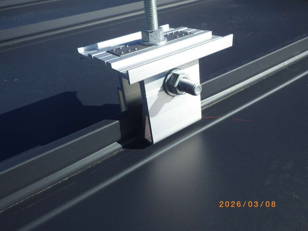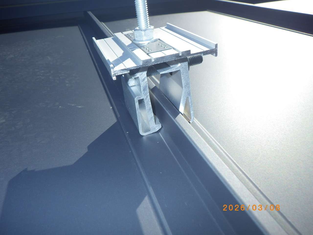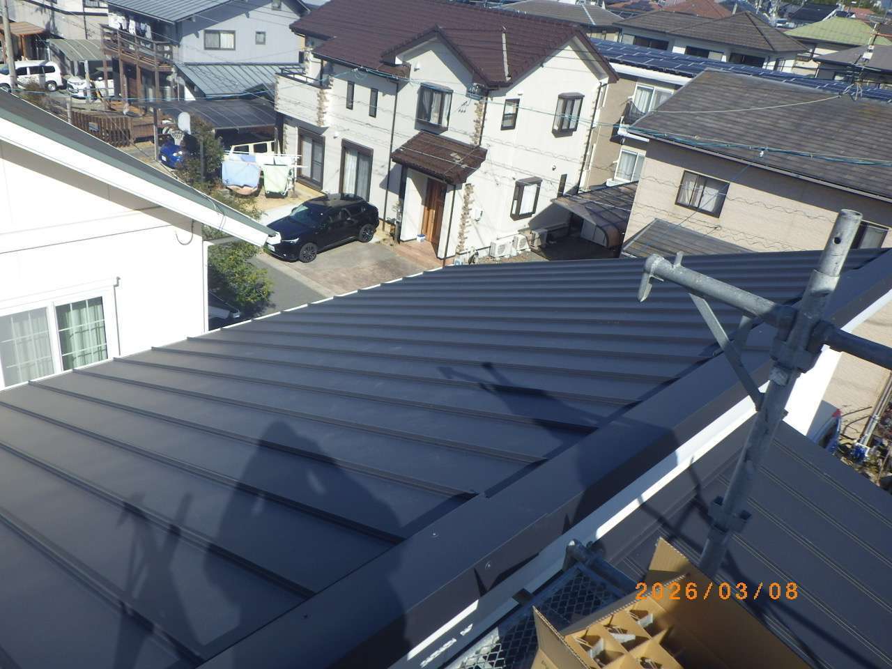屋根形状は立平葺きで、屋根材の構造に合わせた専用工法にて、しっかりと固定・施工しております。